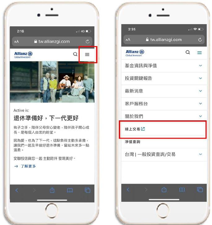 (1) 登入官網首頁,點選右上角導覽選單鈕,打開導覽選單,點選「線上交易」項目後,進入線上交易頁面。