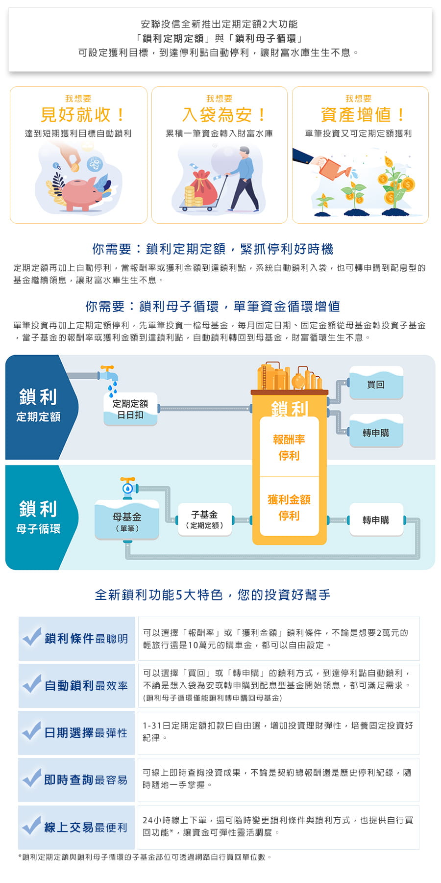 安聯投信全新推出定期定額2大功能,「鎖利定期定額」與「鎖利母子循環」,可設定獲利目標,到達停利點自動停利,讓財富水庫生生不息。