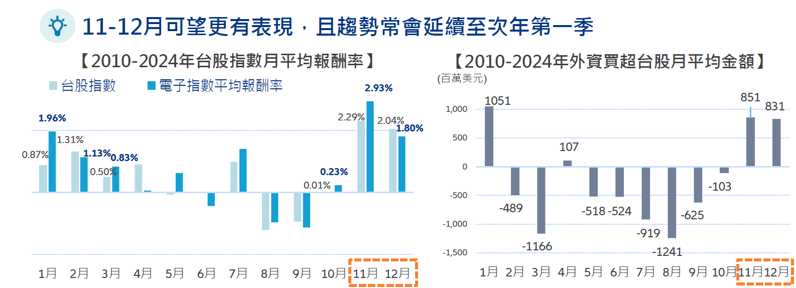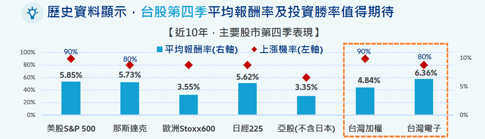 台股與美股連動度高,美股持續創新高帶動下,台股也走出新格局。在AI大趨勢驅動企業獲利動能,Fed降息帶動市場資金行情發酵下,台股可望迎來第四季的傳統股市旺季。根據歷史經驗,台股和美股第四季平均報酬率及投資勝率高,特別是11-12月趨勢通常會延續至次年第一季,台股仍有空間可以期待。