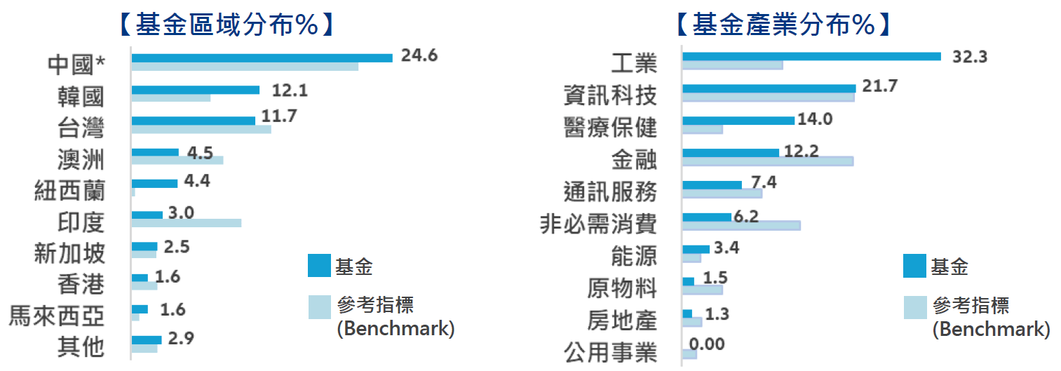 - 基金近一季表現較指標指數好,主要來自香港、中國及澳洲選股貢獻,若以產業來看,醫療保健、金融和非必需消費類股表現較佳。