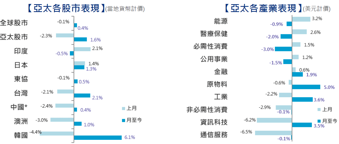 - 亞太股市11月稍事休息,市場也出現了明顯的類股輪動。先前表現領先的科技股出現獲利了結壓力,而能源、公用事業及銀行等具防禦性或收益性的類股相對抗跌。