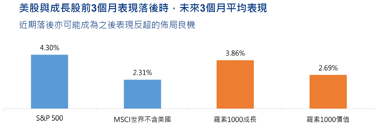 近期美國股市漲幅相對放緩,非美股市表現明顯強勢。多數投資人熟稔的成長股,近期表現亦較先前降溫,使得投資人擔憂成長股是否面臨逆風,或是投資風向可能轉移到非美資產。其實市場短期輪動難免,以2010年至今的3個月滾動報酬來看,美股與成長股平時領先的機會高達7成,若剛好表現落後,未來3個月逆勢超車的機會更大!