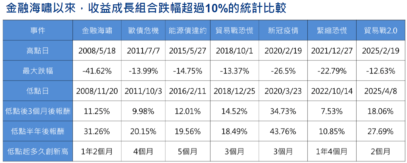 - 但回顧過去經驗,收益成長策略的三大資產組合-美國成長股、可轉債、非投資級債,在面臨10%的修正後,多半能在半年內收復失土。