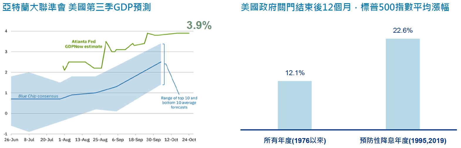 - 雖然因美國政府持續停擺,促使聯準會採取謹慎態度,但另一方面,也來自持穩的經濟表現提供更多觀察時間,整體而言,亞特蘭大聯準會預測美國第三季GDP有3.9%的強勁增長,已公布的3Q標普500企業財報中,獲利成長接近雙位數水準,有近九成優於預期,我們認為,在基本面持穩,企業對AI繼續積極投資和寬鬆政策周期的背景下,有助支持長線結構成長行情延續。