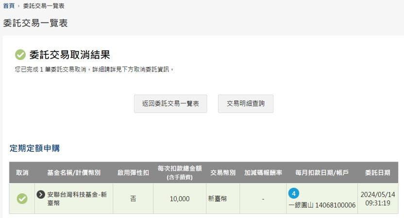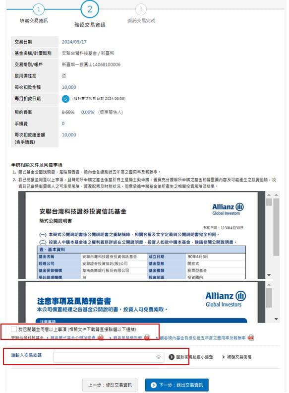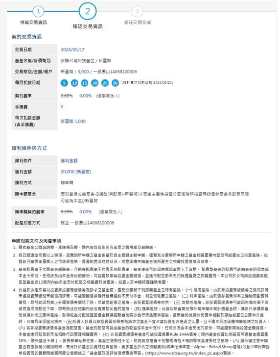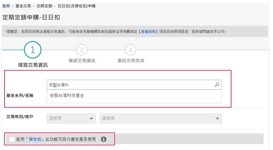 (1) 請確實確認申購基金、申購金額、扣款帳號、每月扣款日期