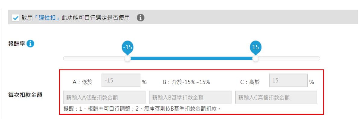 啟用「彈性扣」時,需設定三段報酬率,與對應的投資金額。