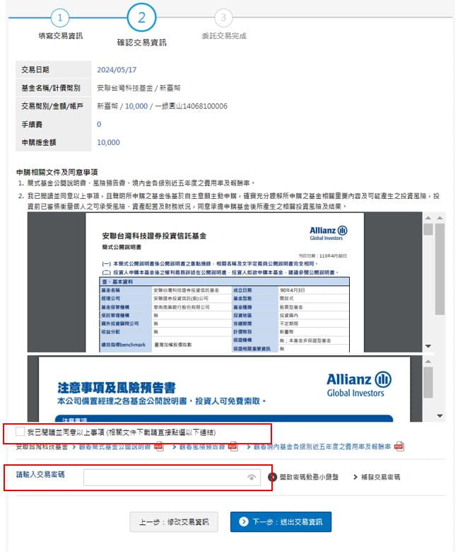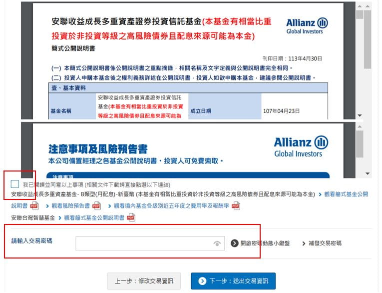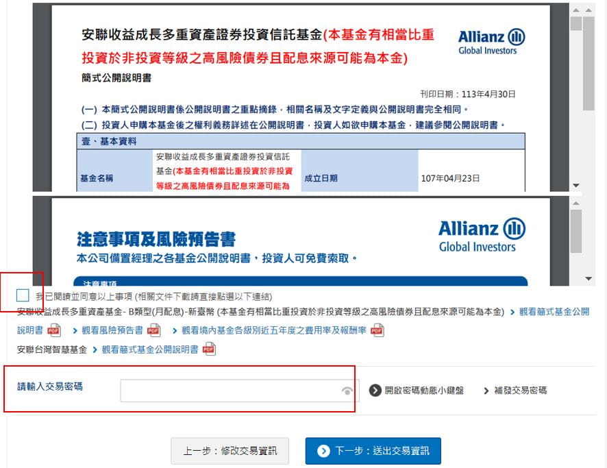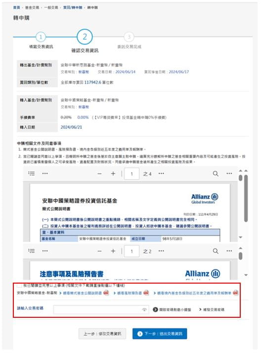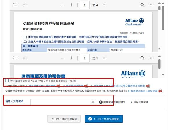 (2) 請點選下方相關文件閱讀後,輸入您的交易密碼