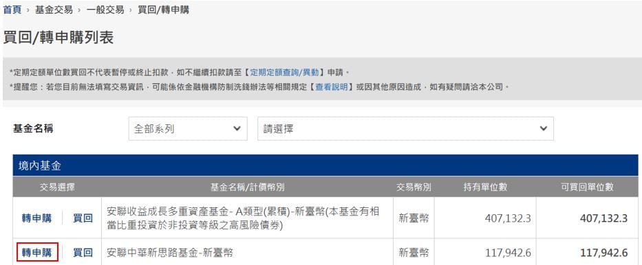 2. 選擇想要轉申購的基金,以下舉 買回安聯中華新思路基金-新台幣 轉申購到安聯中國策略基金-新台幣 為範例