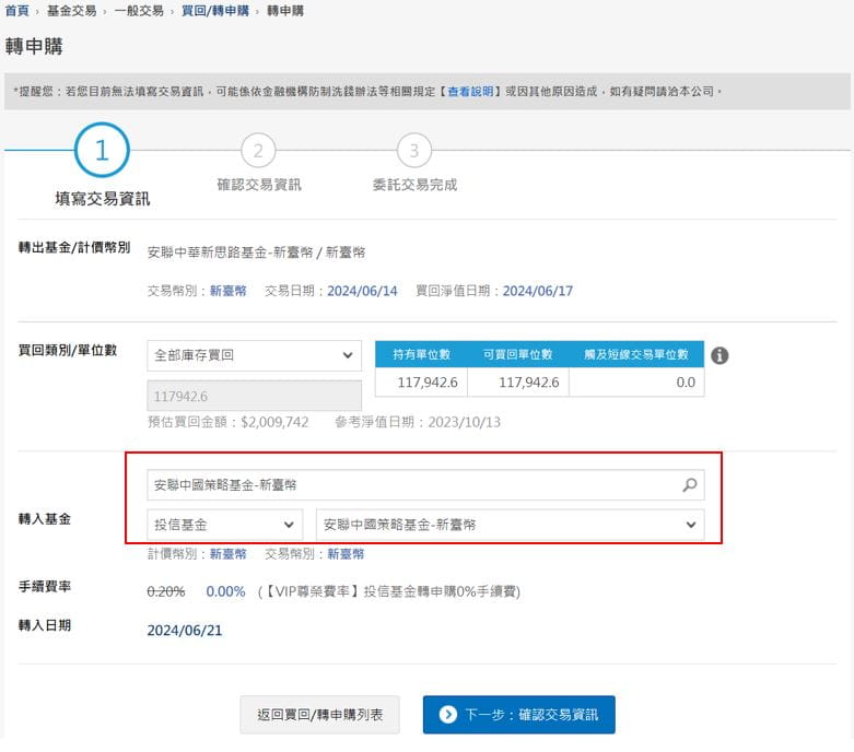 (1) 請確實確認買回基金、單位數與轉申購基金