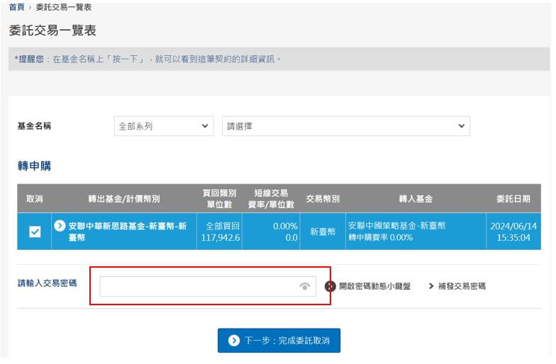 點選想要取消的交易,於下方輸入交易密碼後,點選 完成委託取消 即可取消該筆交易