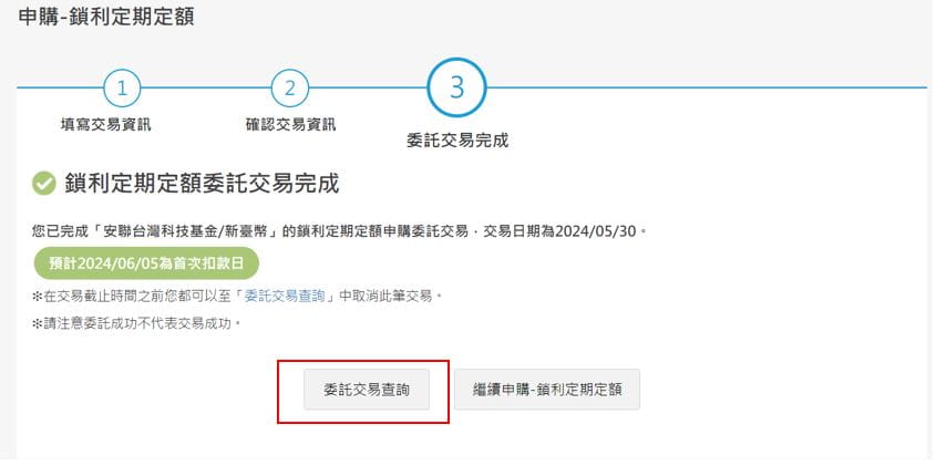 提醒:若您想查詢或取消此筆交易,請點選下方【委託交易查詢】按鈕