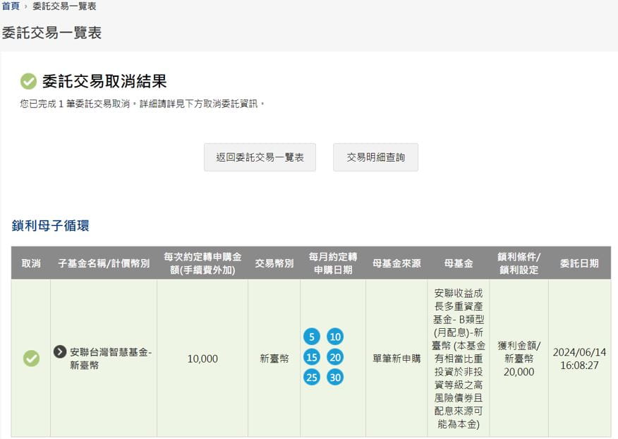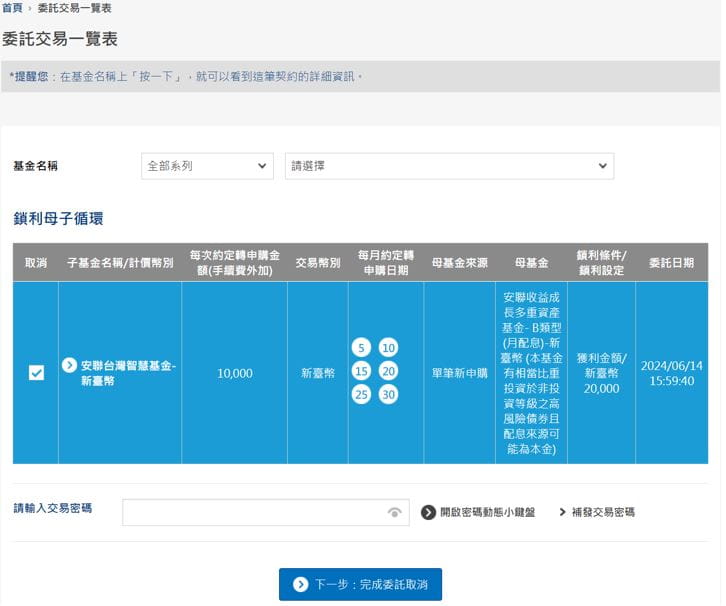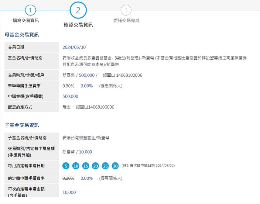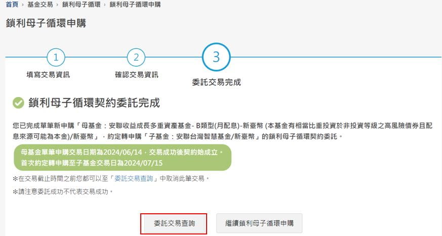 (1) 請確實確認母基金申購基金、申購金額、扣款帳號、每月轉申購至子基金之轉申購金額、轉申購日期、鎖利條件等