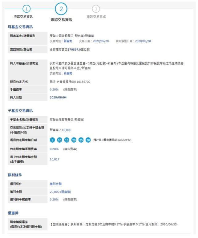 (1) 請確認轉出基金、轉出之買回單位數、母基金名稱、每月轉申購至子基金之轉申購金額、轉申購日期、鎖利條件等